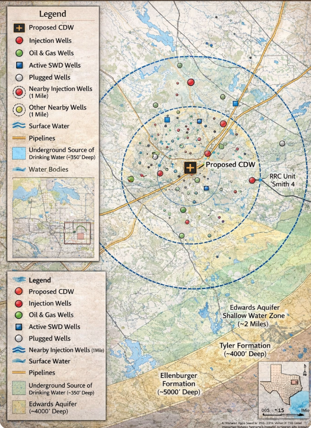 Our Oil & Gas team specializes in creating detailed and defensible map exhibits for regulatory and legal hearings. We have supported the locating of Commercial Disposal Wells and Oil & Gas facilities many times in the past, and our team knows what counts as clear, accurate, and visual evidence for regulators and lawyers.