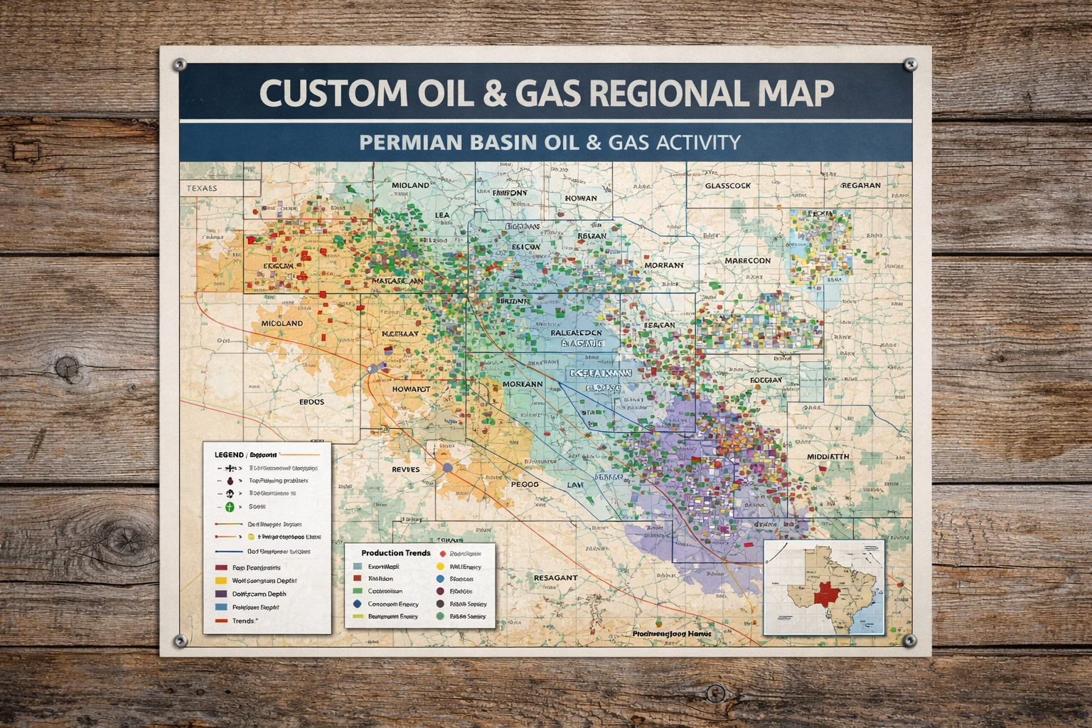 We can integrate fields, depths, formations, operators, trends, production and performance into regional or multi-county map areas in ways that will support executive reporting, investment analysis, and strategic planning, while also looking fantastic on your office wall to show visitors the scale and scope of your work.